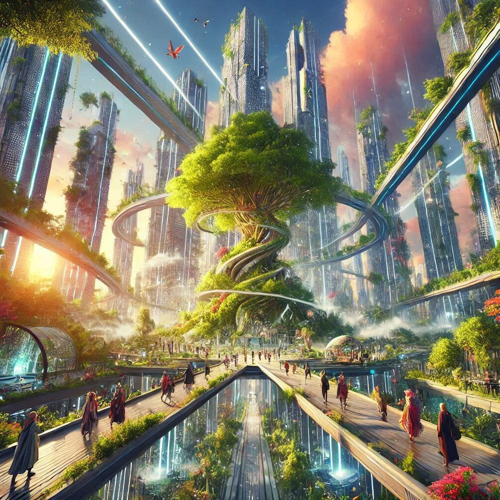 Step into a world where nature and technology intertwine seamlessly in a visually stunning landscape. Imagine towering skyscrapers adorned with lush greenery, creating a perfect harmony between urban development and environmental preservation. The sky above is a canvas of vibrant colors, hinting at a world beyond our imagination. In this scene, a diverse group of culturally rich characters explore this vibrant world, each uniquely dressed to reflect their background and personality. Their interactions with the environment convey a sense of wonder and curiosity as they navigate through the intricate details of this futuristic realm. π