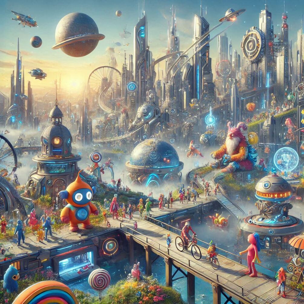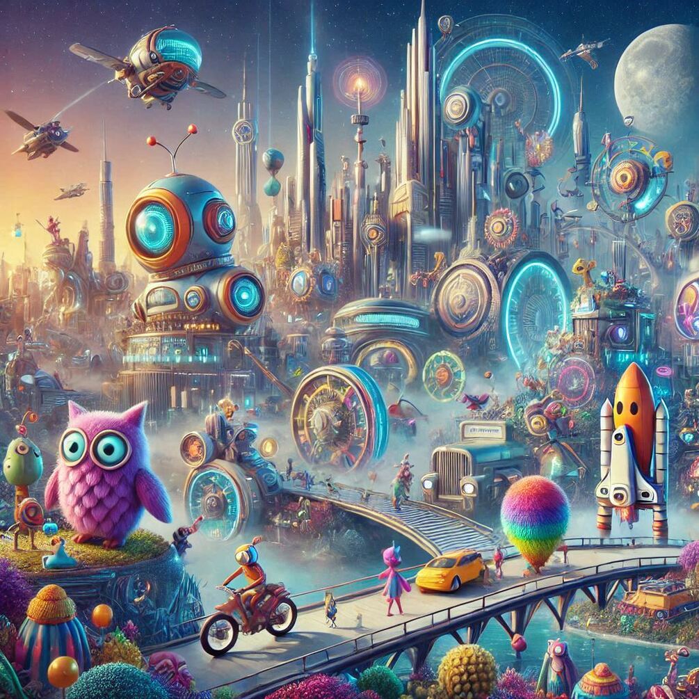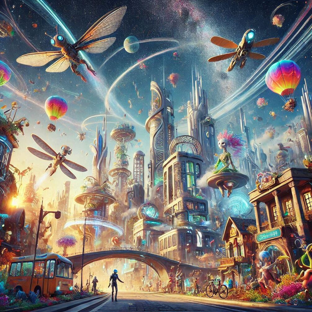 Step into a world where the charm of cartoons meets the wonder of science fiction in a visually stunning artwork that will captivate your imagination. Join a group of colorful characters as they navigate through a bustling metropolis on a distant planet, filled with advanced technology and fantastical creatures. From flying cars to alien explorers, this vibrant cityscape is teeming with energy and excitement.