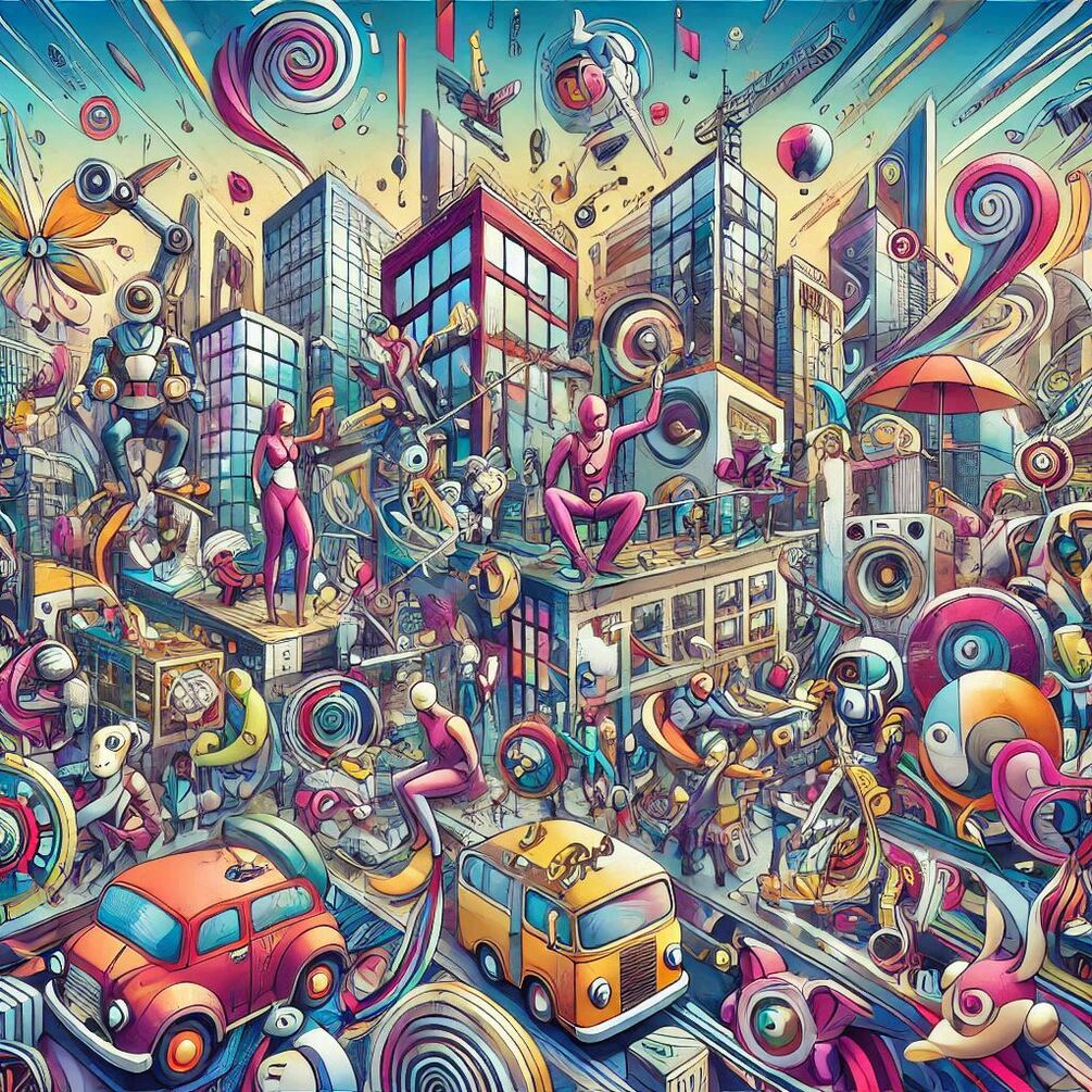 Dive into a futuristic cityscape where colorful characters with unique personalities and styles come to life in this dynamic and visually stunning composition. Explore a world where technology and fantasy collide, bringing a sense of movement, energy, and humor to every corner. With bold colors, intricate details, and playful poses, this image captures the essence of modern cartoons in a way that resonates with contemporary audiences.
